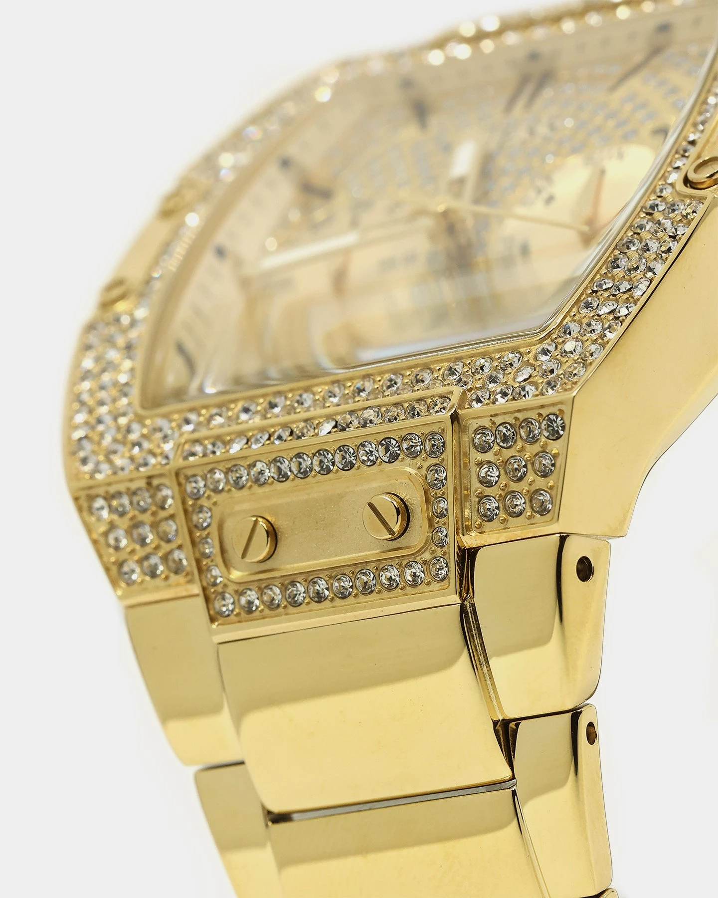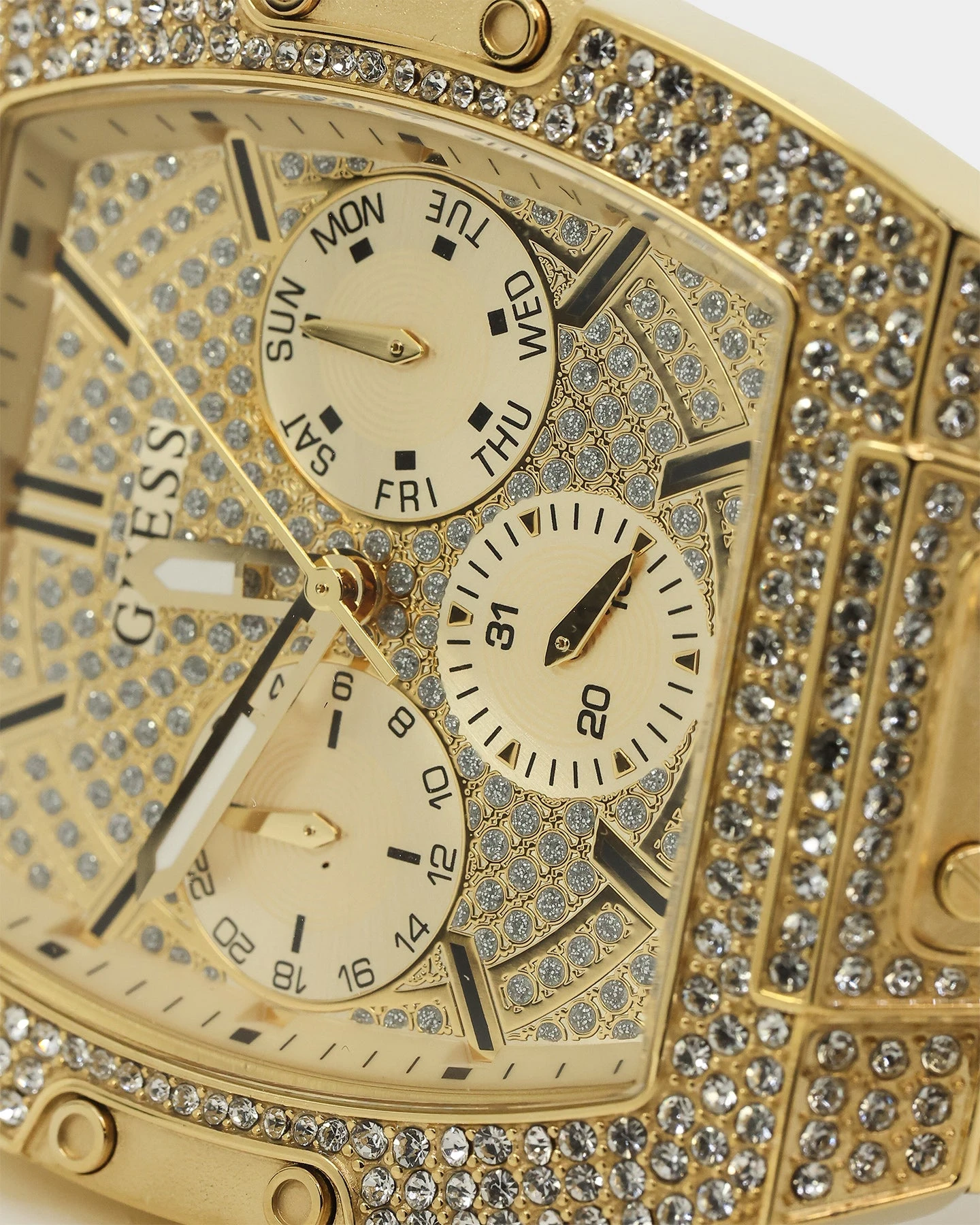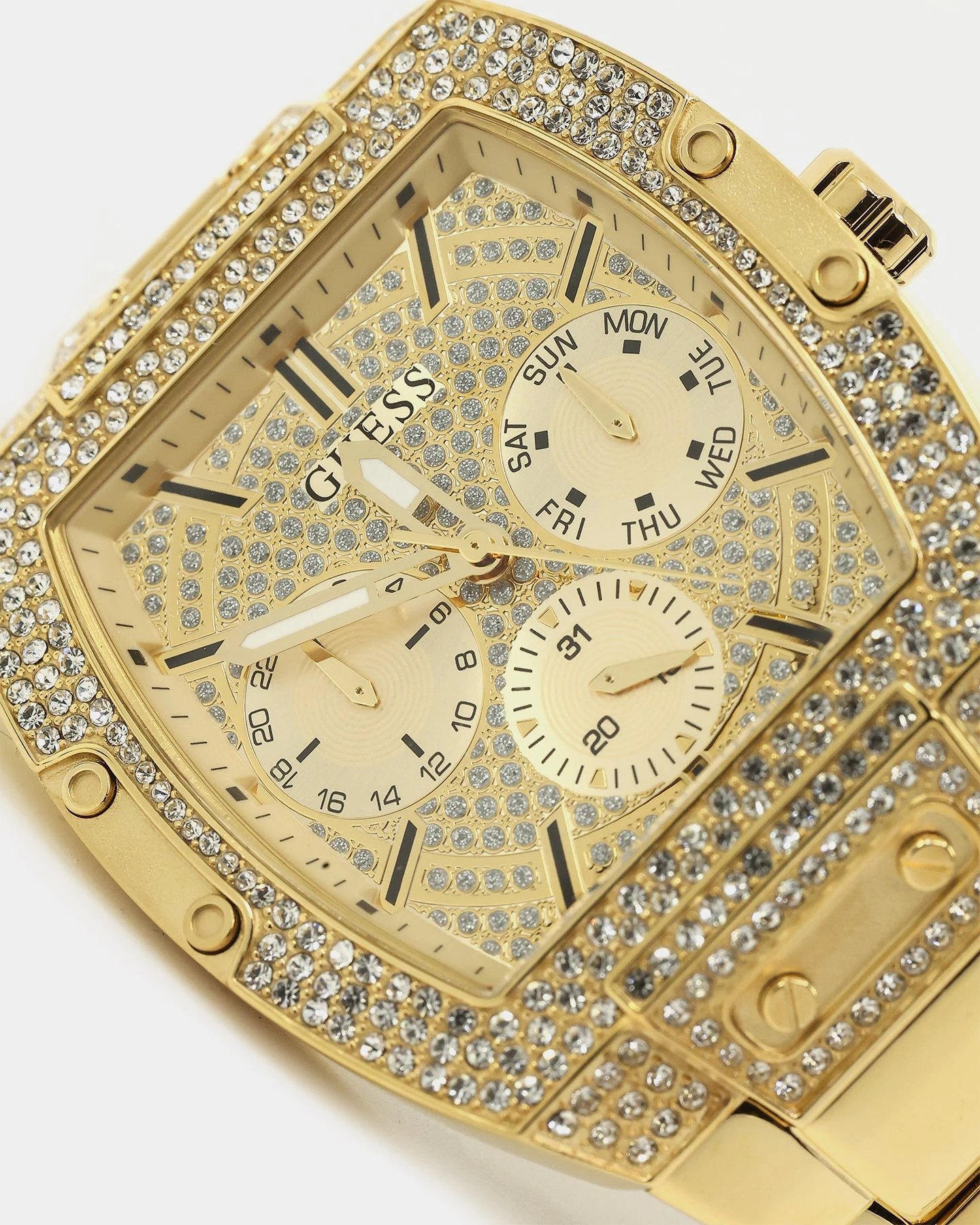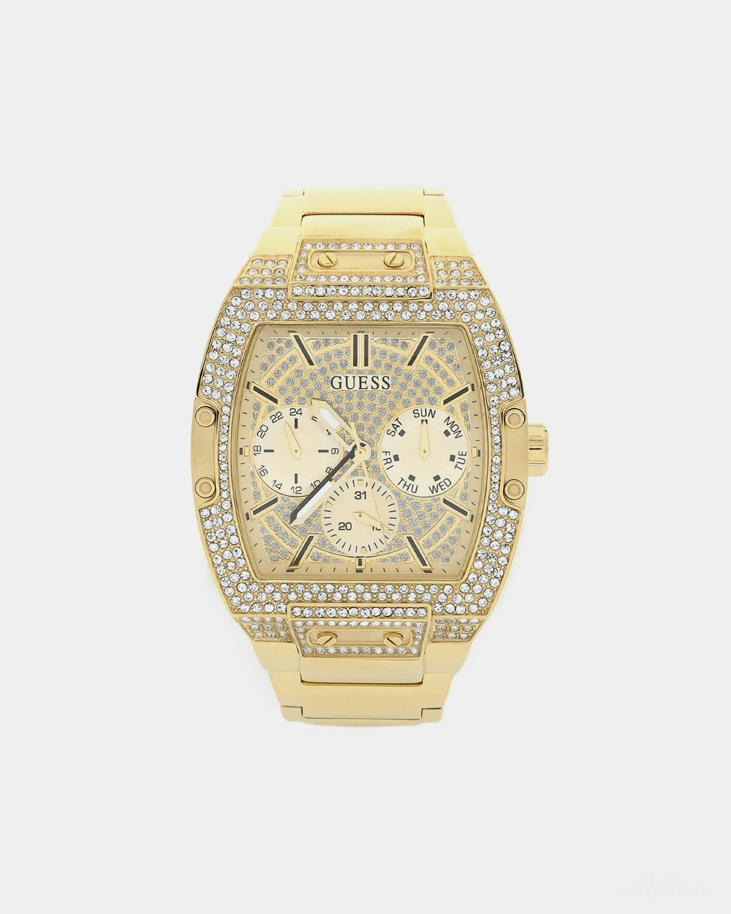 Bling it on with this oversized timepiece! It boasts 314 crystals on its barrel shaped case with a full glitz multi-function dial.