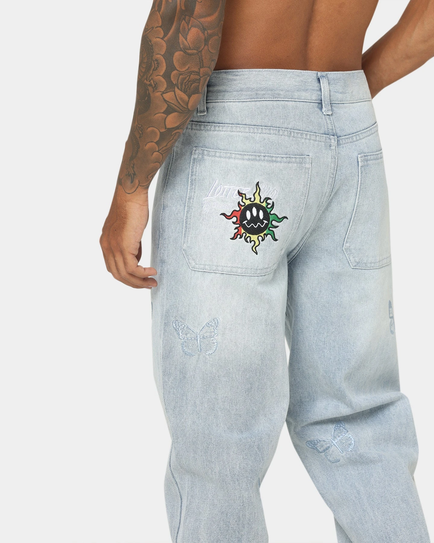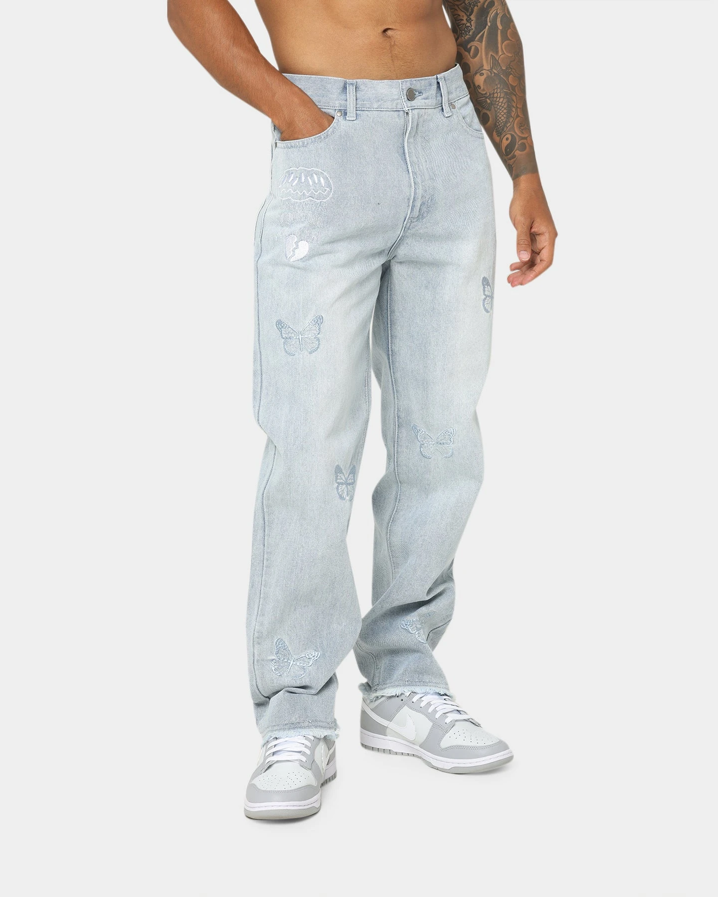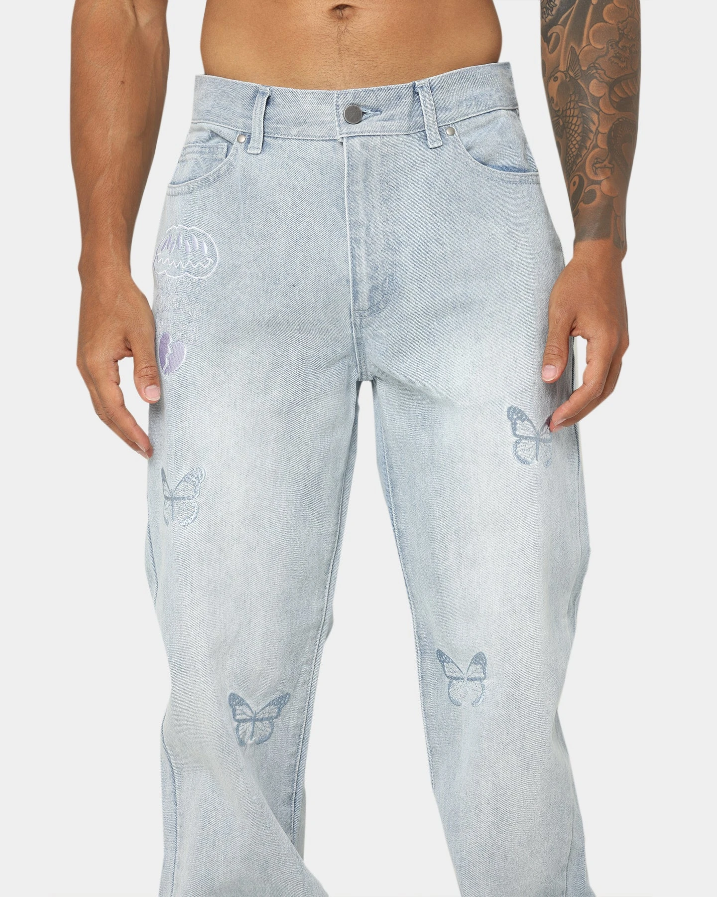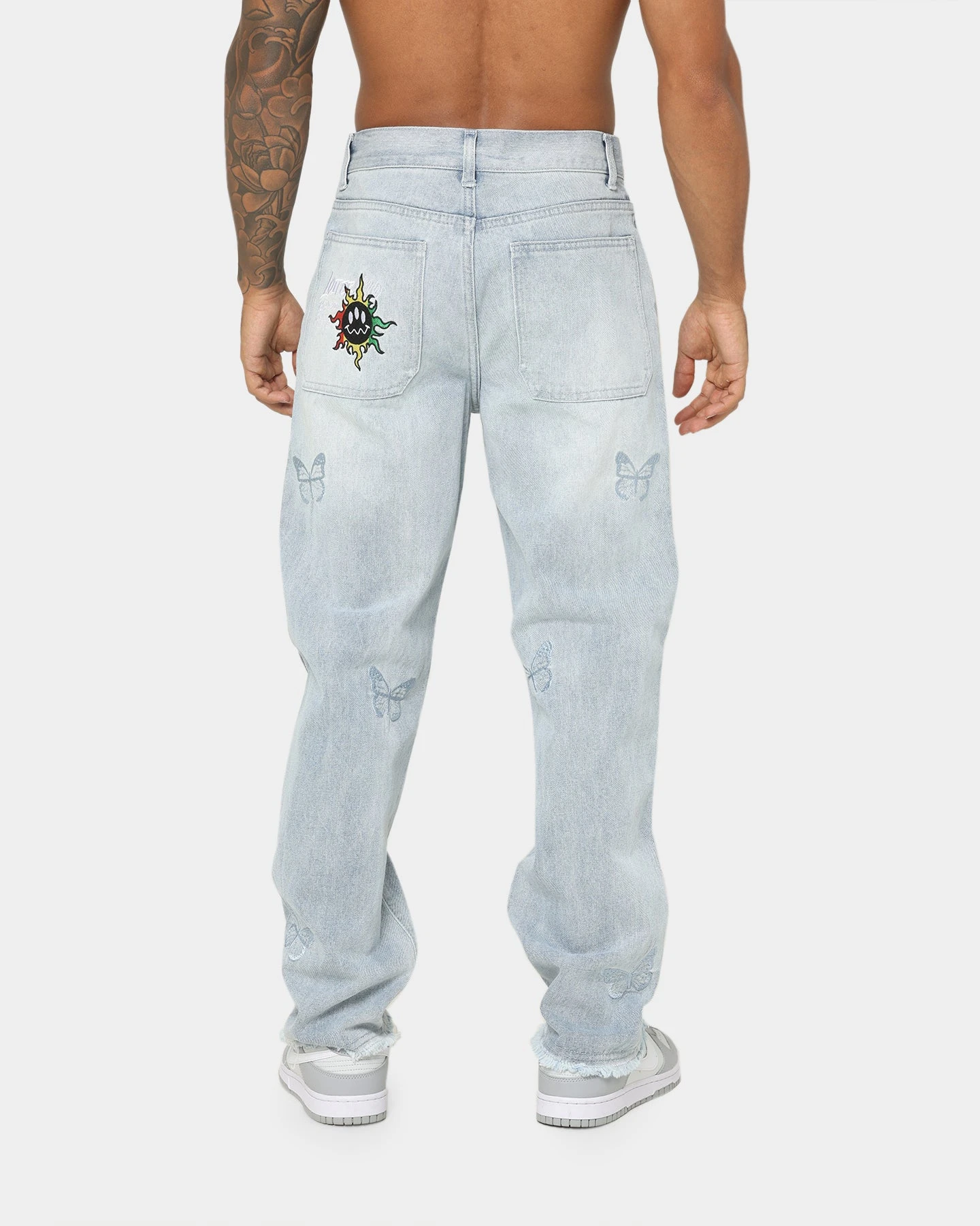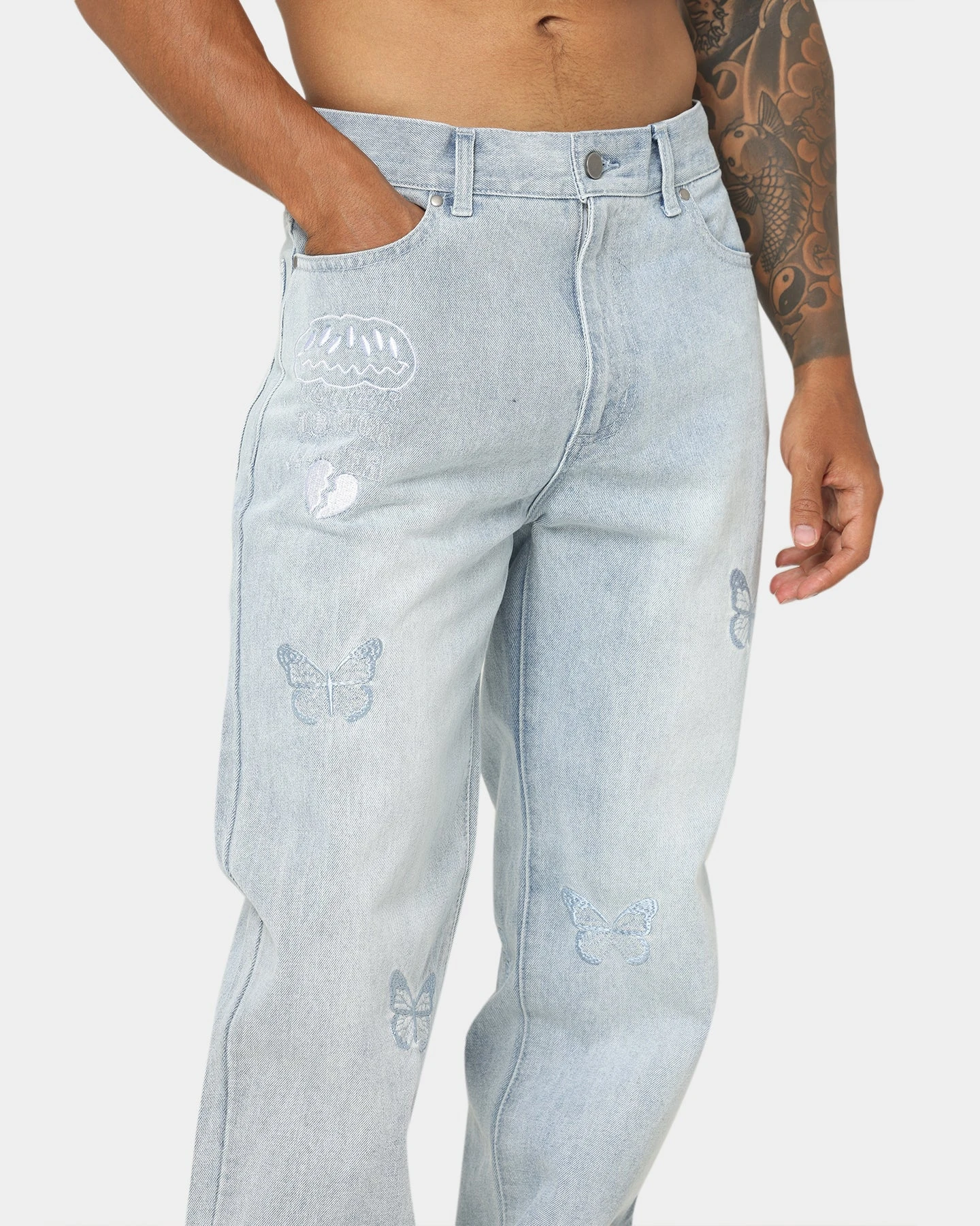 Live your best life in the Freedom Skate Jeans from Loiter. The standout element of these jeans is by far the detailed all over embroidery from the custom artwork on the pockets to the scattered butterflies. Finished with raw edge hems on the cuffs and an acid wash. Get in before stocks disappear!