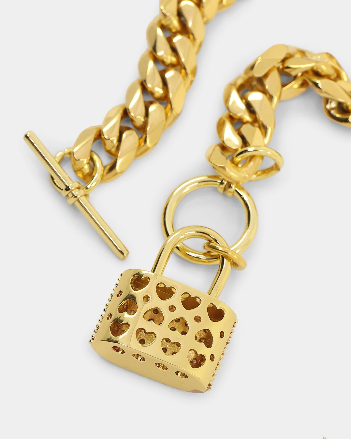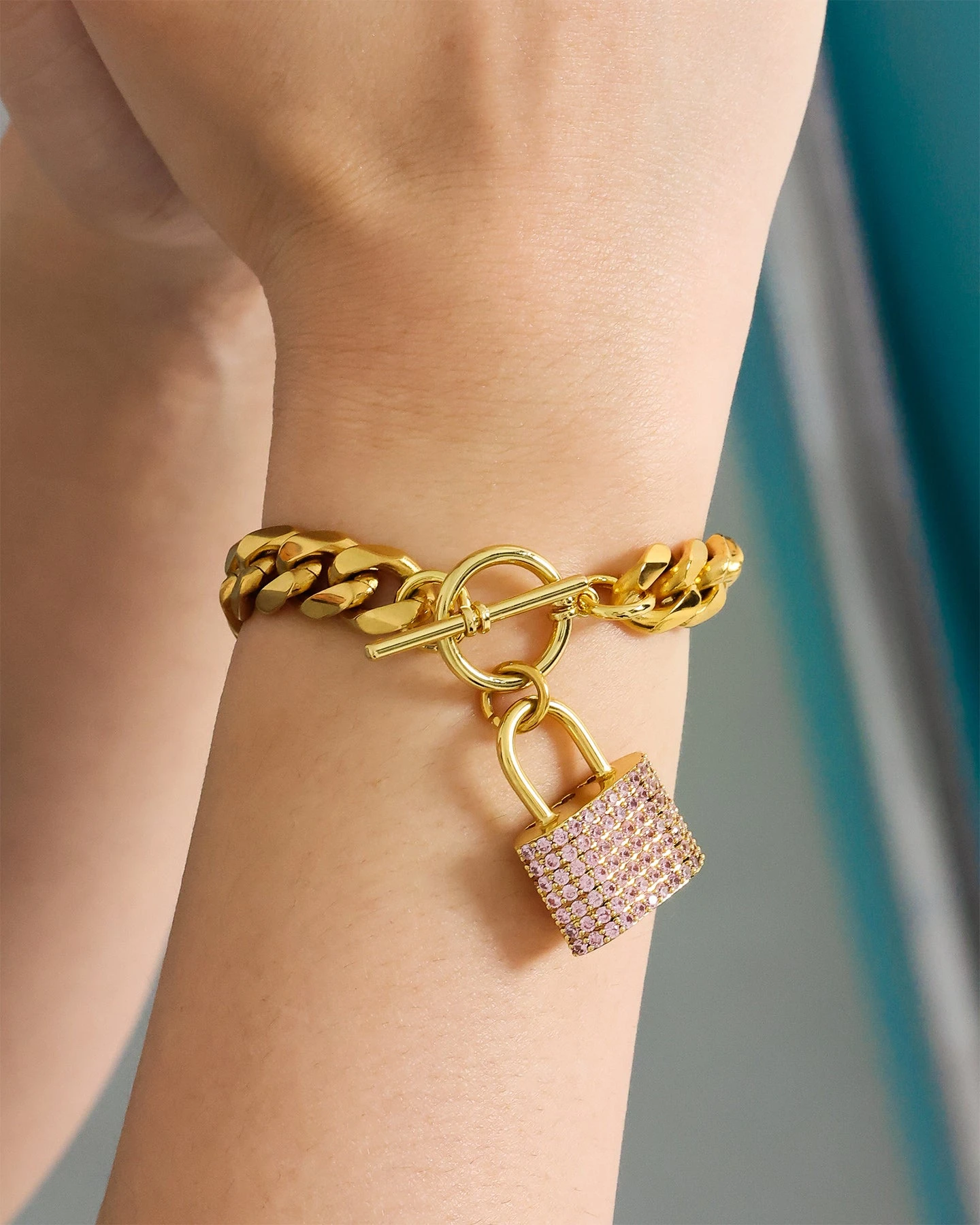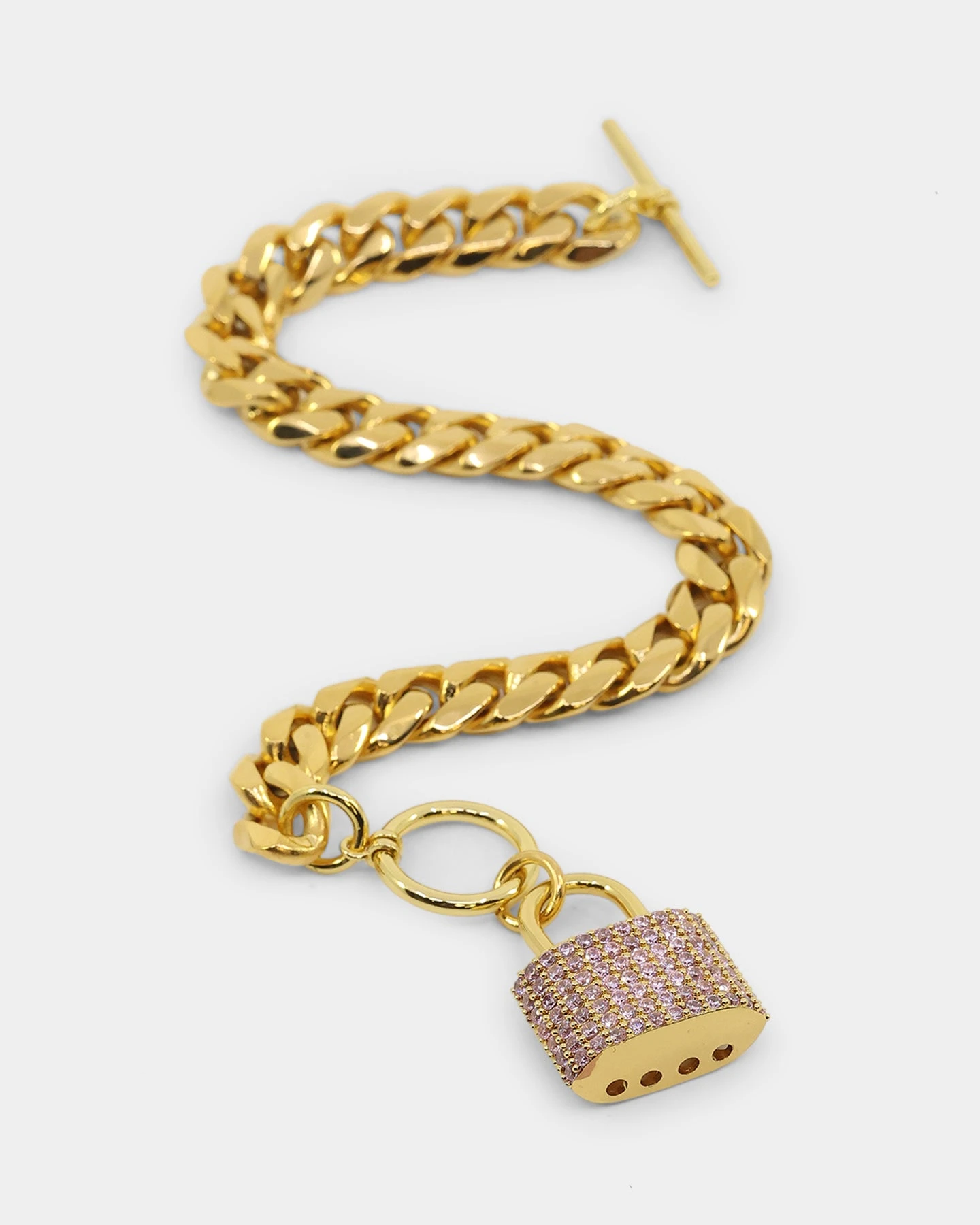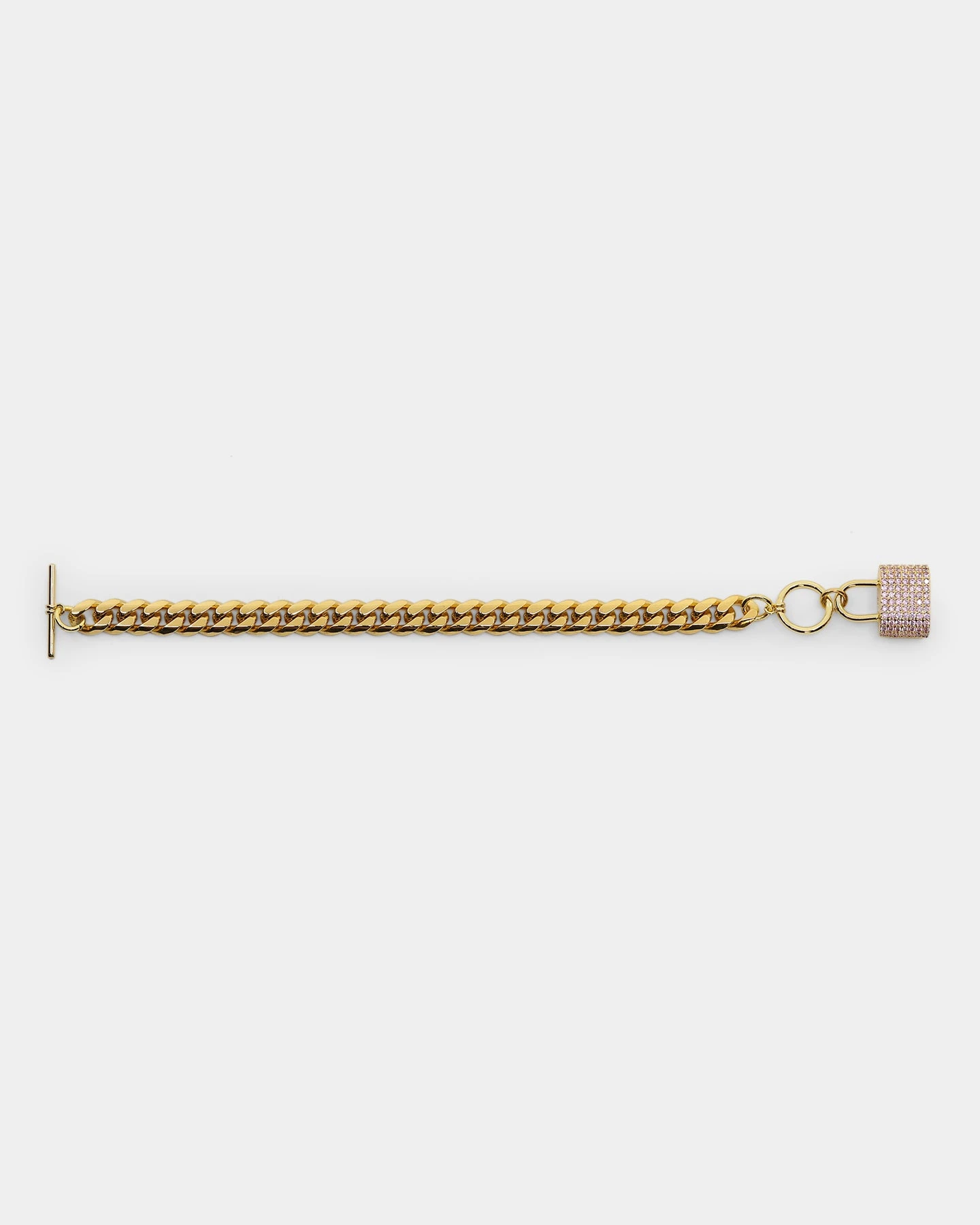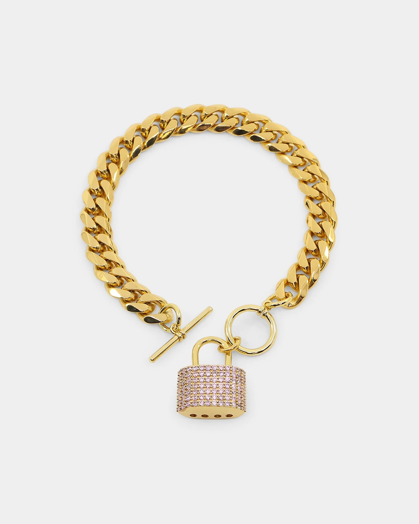 On its own or paired as a stack, the Women’s Iced Padlock Bracelet will bring forth your radiance. The 18K gold plated Cuban chain gives off a luxurious shine and the pink cubic zirconia stones on the padlock pendant catch the light.