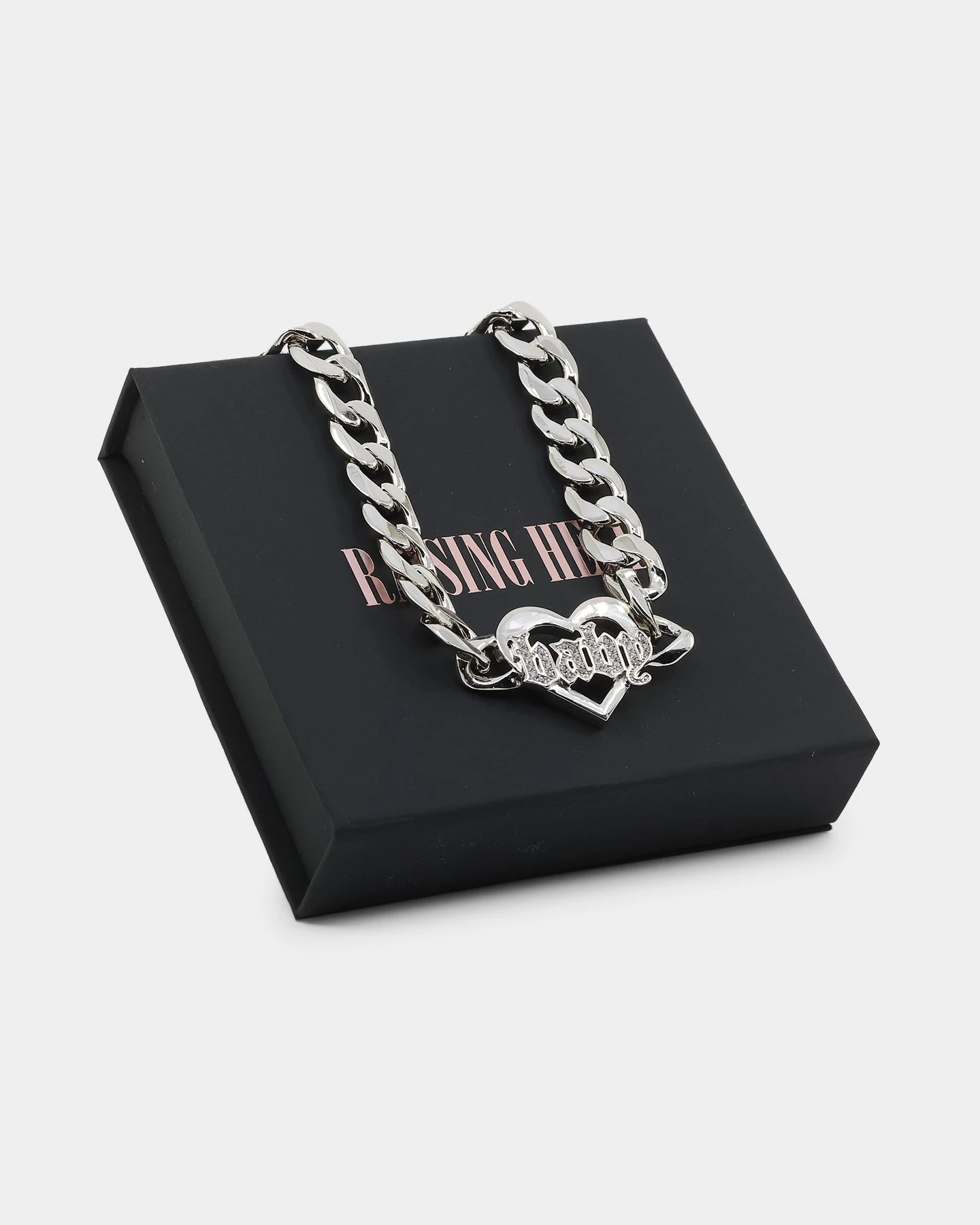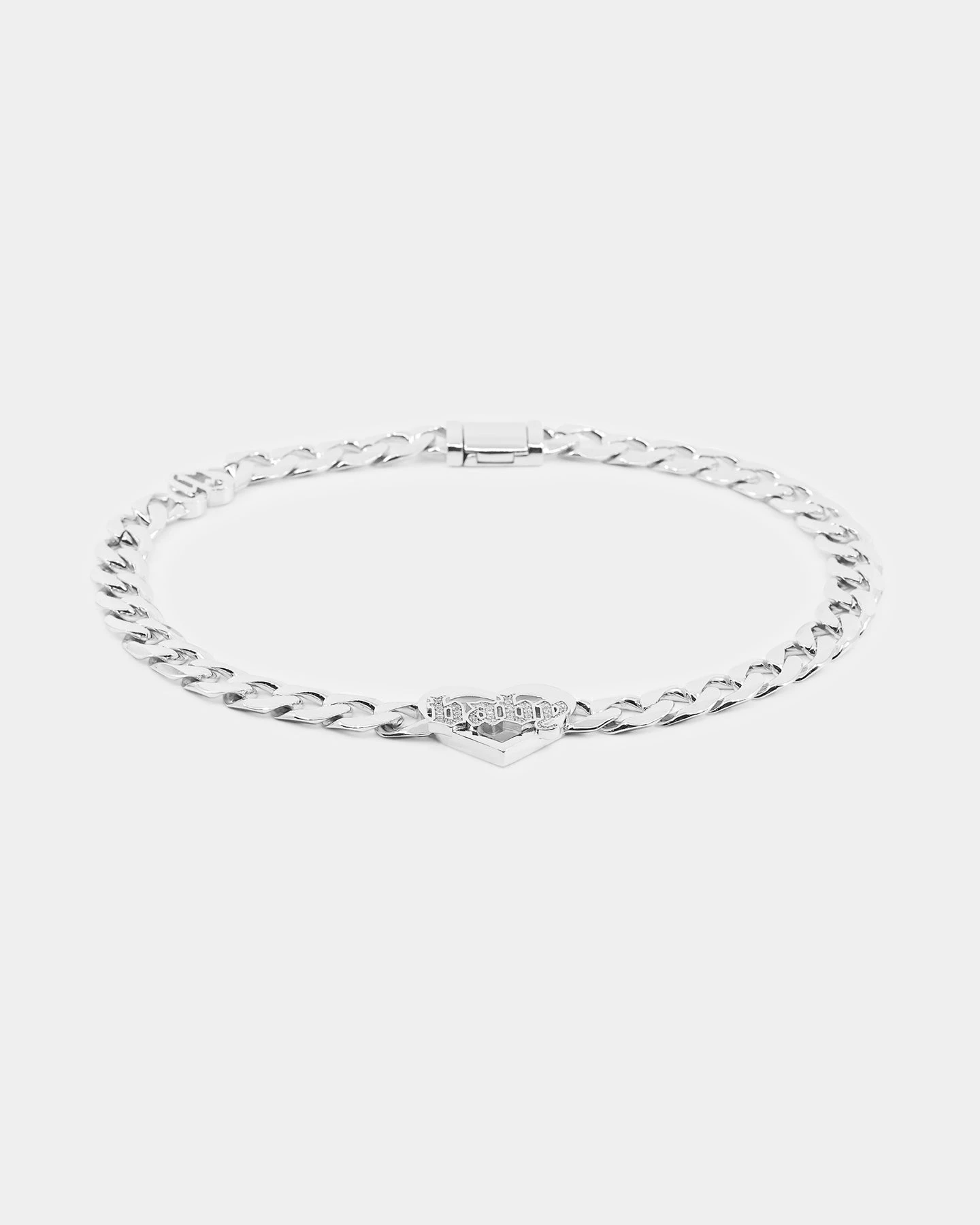 A tough chain pairs with a delicately designed iced heart pendant for the Love Your Girl Chain. 18k white gold plating and CZ stones pair for the ultimate chain necklace to accessorise your outfit.